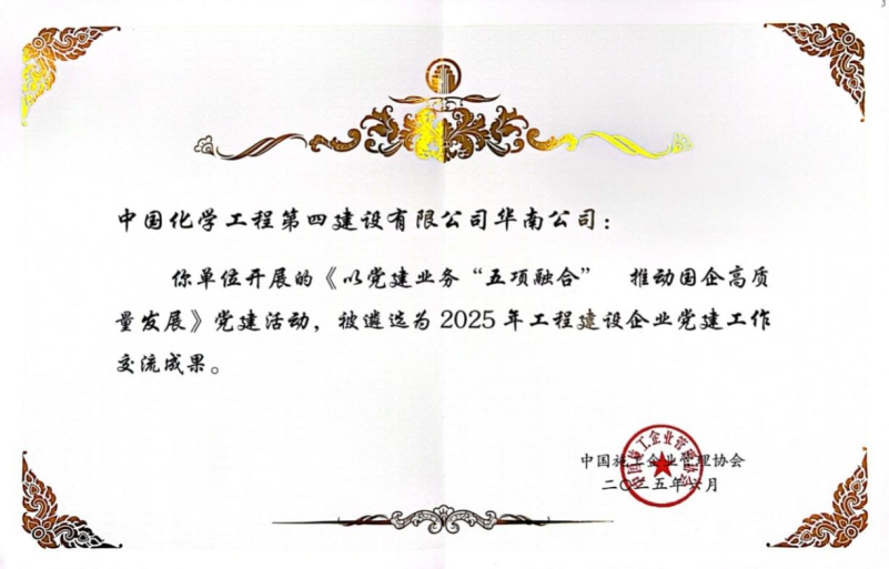 6月27日,中國施工企業(yè)管理協(xié)會2025年工程建設(shè)企業(yè)黨建工作成果交流會在京召開,會上發(fā)布2025年工程建設(shè)企業(yè)黨建工作成果推廣名單。由中國化學(xué)四化建華南公司申報的《以黨建業(yè)務(wù)“五項融合” 推動國企高質(zhì)量發(fā)展》黨建項目案例從全國1000余項申報案例中脫穎而出,成功入選。這也是四化建參加中國施工企業(yè)管理協(xié)會開展的工程建設(shè)企業(yè)黨建工作典型案例征集活動以來,連續(xù)五年榜上有名。