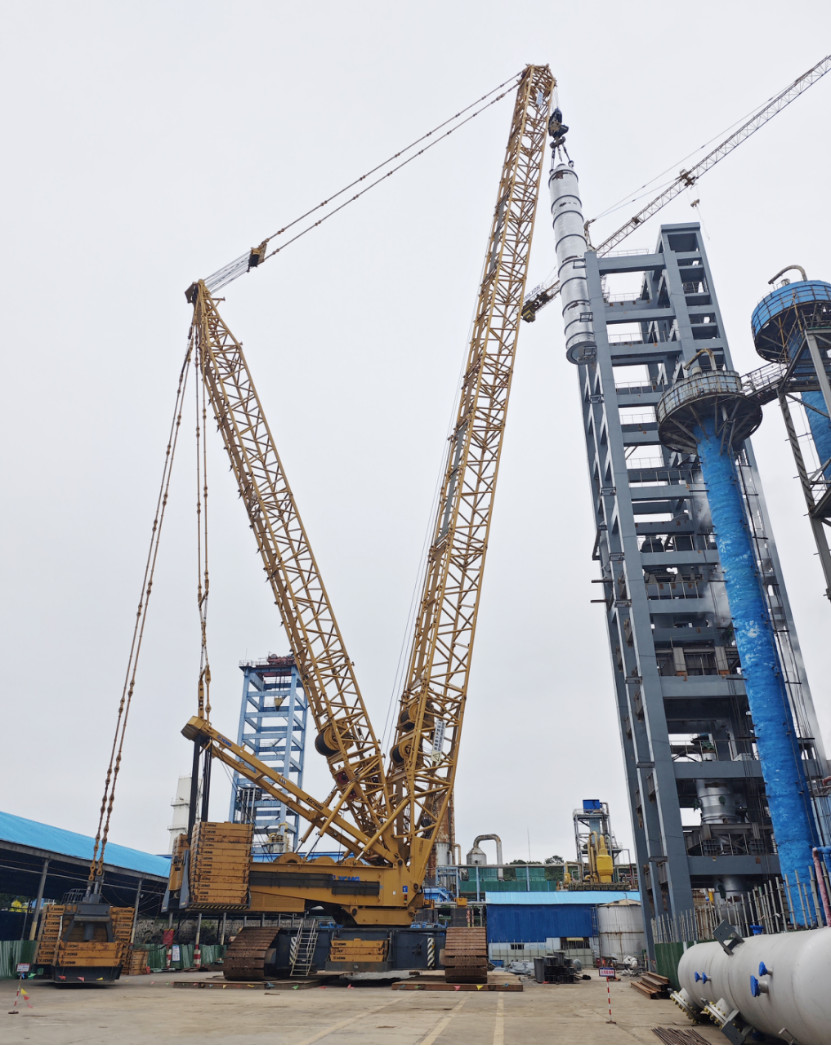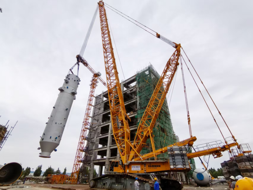作為華強化工尿素生產(chǎn)線的“心臟”設(shè)備與整個升級改造工程的核心樞紐,此次吊裝的尿素合成塔高27.5米、直徑3米,其安裝精度直接關(guān)乎裝置投用后的運行效能。為了確保一次順利將這臺核心設(shè)備吊裝成功,項目部前期反復(fù)論證、優(yōu)化專項方案,最終確定采用“雙機抬吊”工藝:以1250噸履帶吊為主吊設(shè)備,搭配900噸汽車吊協(xié)同溜尾作業(yè),精準(zhǔn)匹配設(shè)備重量與現(xiàn)場工況。同時,項目部始終將“安全第一”貫穿全程,吊裝前嚴(yán)格開展吊索具全面檢查,科學(xué)劃定警戒區(qū)域,明確各崗位操作規(guī)范,全程實時監(jiān)控吊裝姿態(tài)與受力情況,最終實現(xiàn)設(shè)備“零誤差”精準(zhǔn)落位,整個作業(yè)安全高效、一氣呵成。